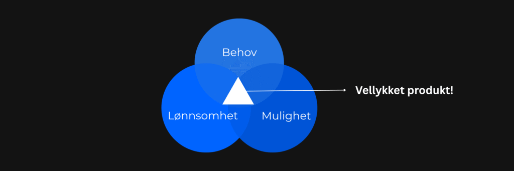 Disse grunnene og definisjonen ovenfor gjenspeiles i det helhetlige tankesettet som Design Thinking representerer! Som du ser i denne illustrasjonen bidrar Design Thinking til at du treffer på alle disse tre punktene: at det er folk som har behov for noe; at det er teknologisk mulig å få til; og at produktet/tjenesten skal gi bedre inntjening enn det koster å lage!