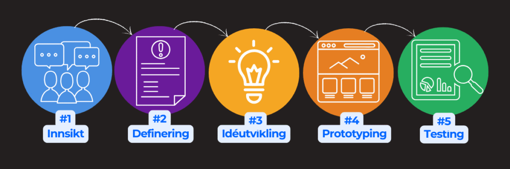 Prosessen er som du ser i bildet ovenfor delt inn fem faser hvor du først begynner med å hente innsikt om kundene dine, før du setter deg ned å definerer problemet de ønsker å få løst, før du begynner å utvikle ideer, og til slutt lage protopyer som du tester! Denne måten å jobbe gjør deg i stand til å lykkes med din produkt og tjenesteutvikling akkurat som eksemplene ovenfor!